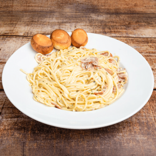 mit Scampi, Champignons, Sahnesauce und Knoblauch auf Wunsch